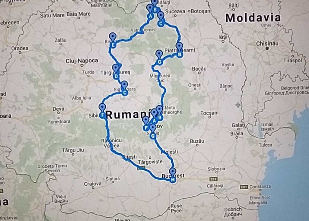 Bucarest, Cozia, Sibiu, Sighisoara, Targu Mures, Bistrita, Moldovita ,Voronet, Piatra Neamt, las Gargantas de Bicaz, el Lago Rojo, Brasov, Prejmer, Bran, Brasov, Sinaia. El recorrido no está mal, pero a nosotros nos pareció corto, se nos pasó el tiempo volando y nos quedamos con ganas de conocer más de ese precioso país.