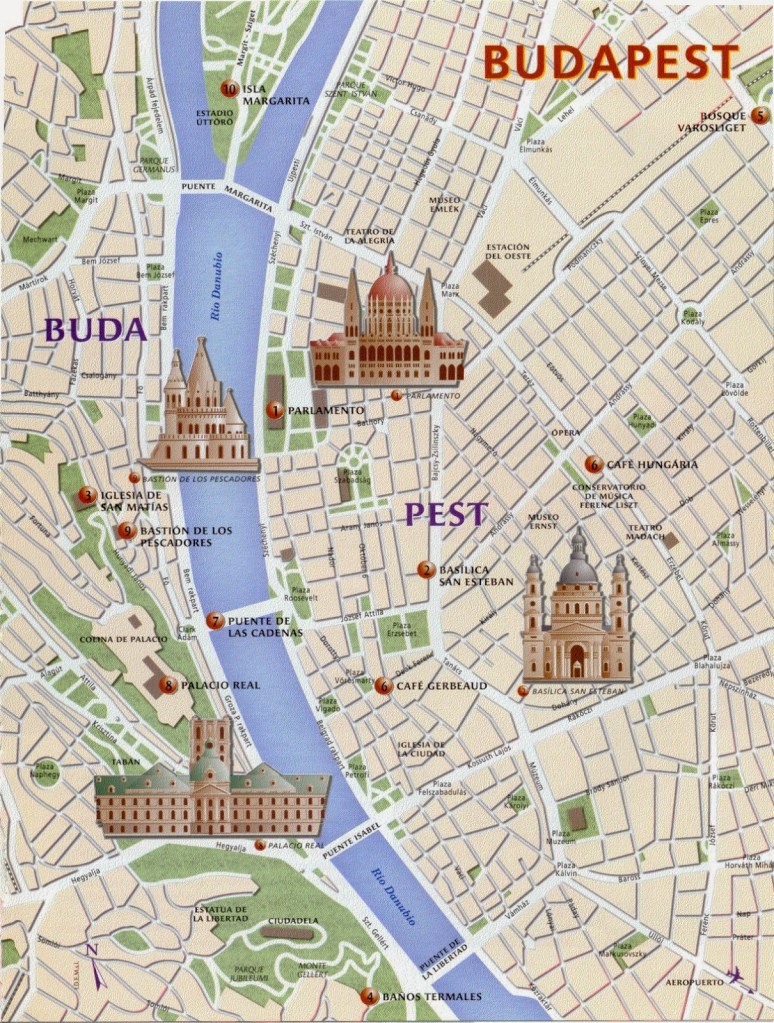 En realidad la capital son dos ciudades separadas por el Danubio. La ciudad histórica o antigua es Buda y la moderna es Pest. Ambas mitades están unidas por varios puentes, algunos muy emblemáticos, como por ejemplo el puente de Isabel (en honor a la famosa emperatriz Sisi).